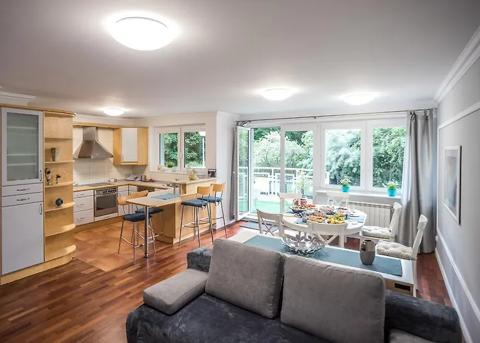 Victus Apartamenty, Apartament Silver Sopot ligger ungefär 10 minuters bilresa från Dwór Hiszpański-byggnaden och inom 3 km från en familjeanpassad sevärdhet som Oliwas djurpark. Den här 109 m² stora lägenheten erbjuder en parkering på plats till 15 PLN per dag.